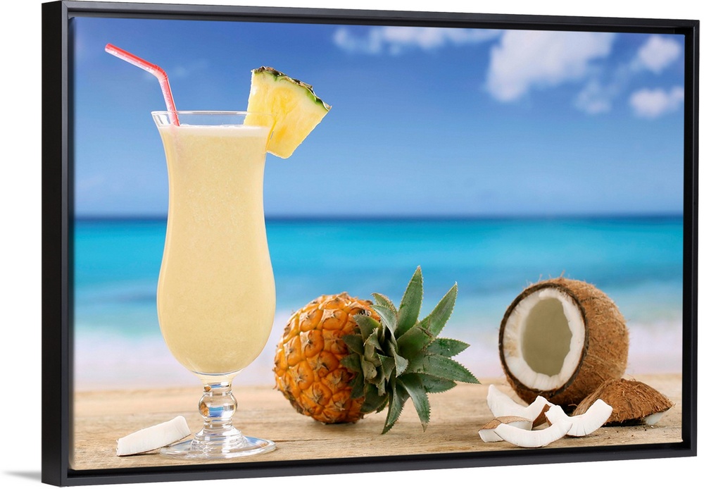 <p>Pina Colada cocktail with fruits on the beach while on vacation.</p>