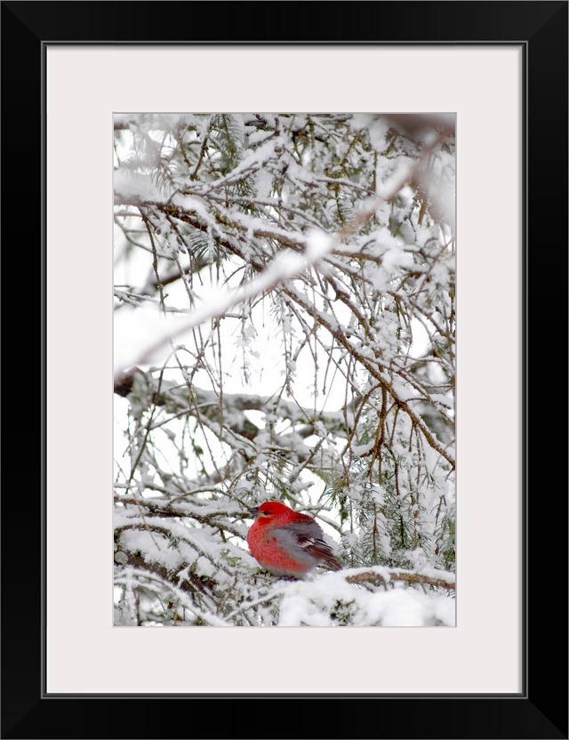 <p>A single fat red bird sits on a snowy cluster of pine tree branches.</p>