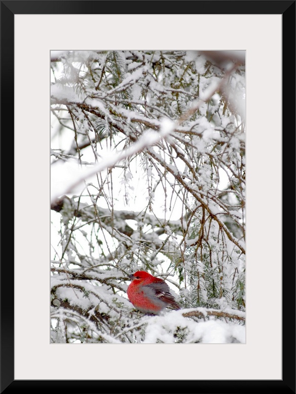 <p>A single fat red bird sits on a snowy cluster of pine tree branches.</p>