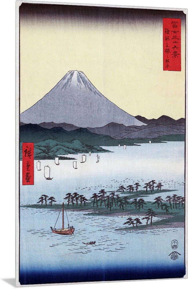 <p>Hiroshige, Suruga, C1850. Pine Groves And Mount Fuji On Miho Bay In Suruga Province, Japan. Woodcut By Ando Hiroshige, C1850.</p>