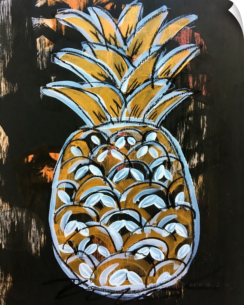 <p>Pineapple painted in an expressionistic style, in white and gold, on a black brushed background.</p>