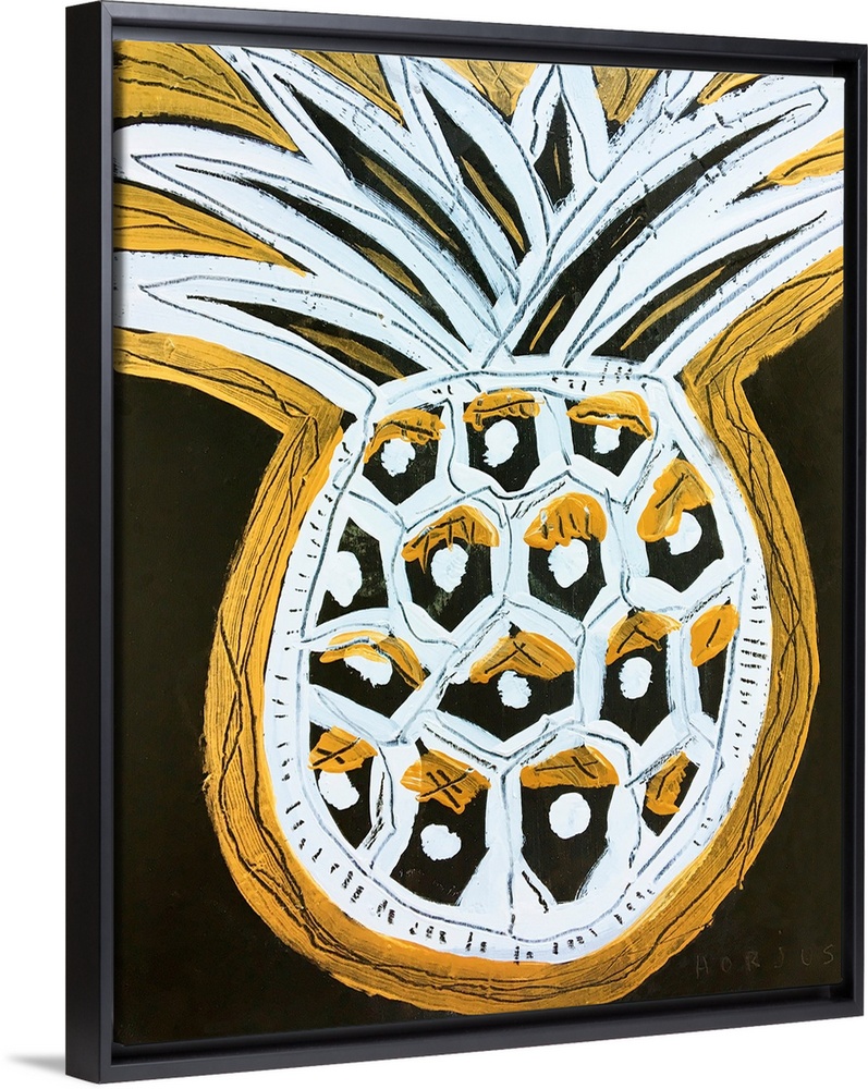 <p>Pineapple painted in an expressionistic style, in white and gold, on a black brushed background.</p>