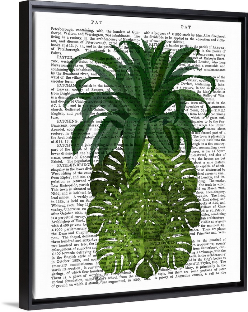 <p>Decorative art of the shape of a pineapple made with tropical leaves painted on the page of a book.</p>