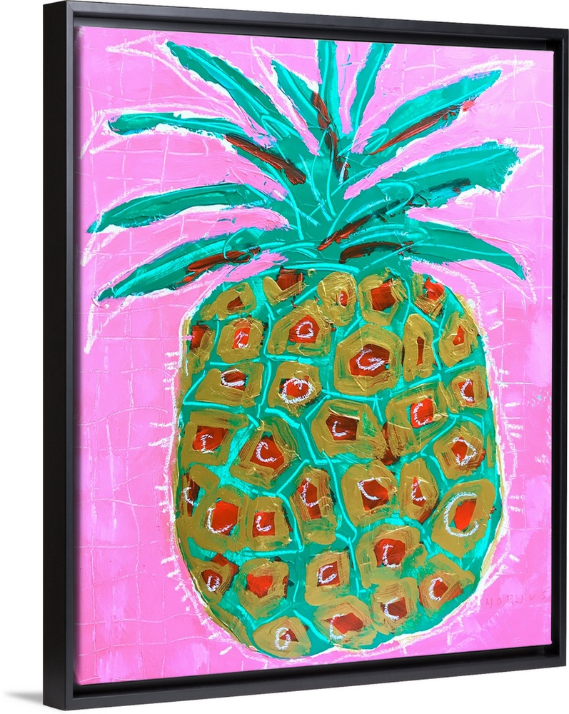 <p>Pineapple painted in bright watercolor colors on a bright pink background.</p>