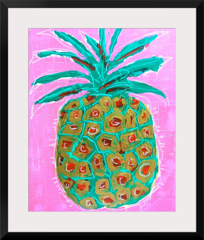 <p>Pineapple painted in bright watercolor colors on a bright pink background.</p>