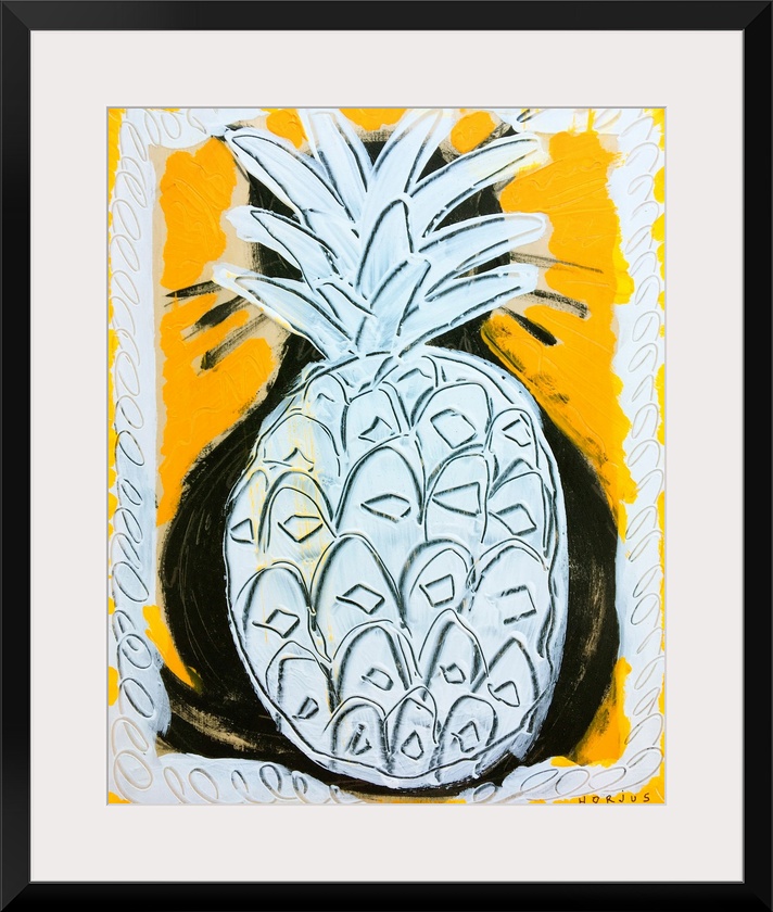 <p>Pineapple painted white for its body and leaves on a yellow graphic background.</p>