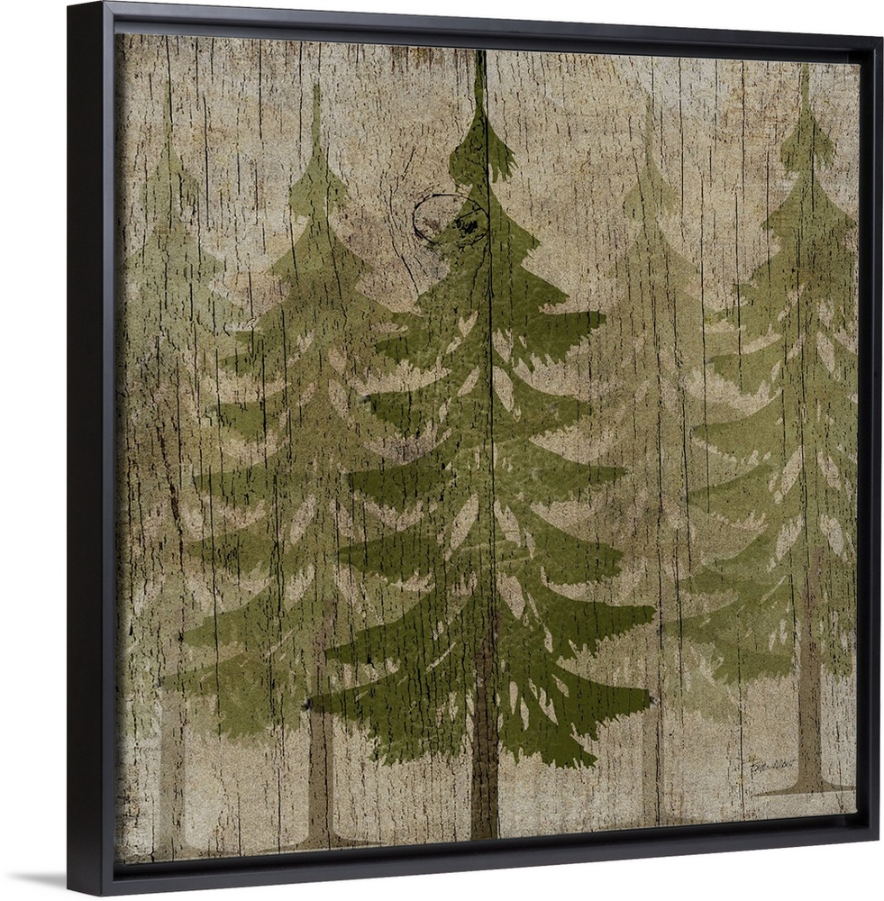<p>Stylized forest of green pine trees on a faux weathered wooden board.</p>