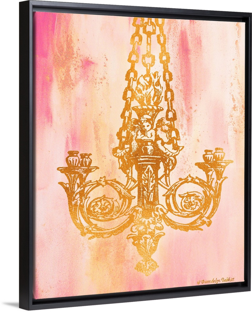 <p>An illustration of a chandelier in gold over a pink background.</p>