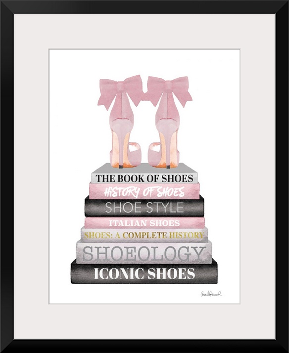 <p>Shoes sit atop a stack of designer books.</p>