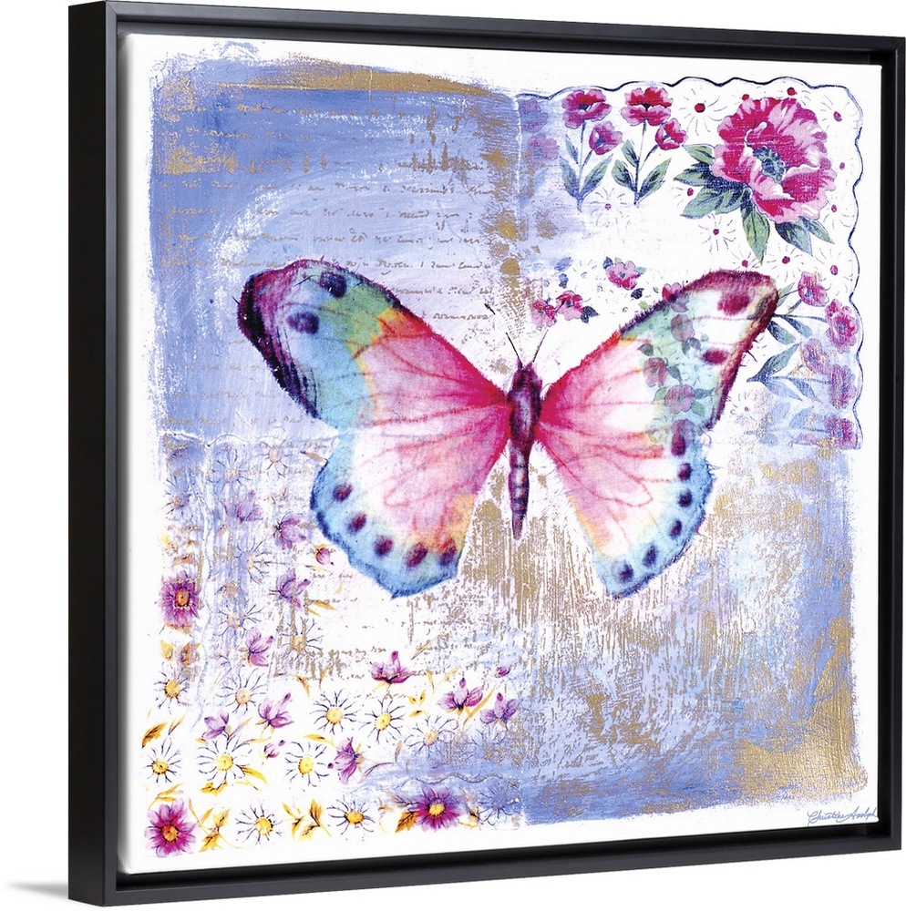 <p>A watercolor painted butterfly takes up majority of this square piece with flowers delicately painted in two corners.</p>