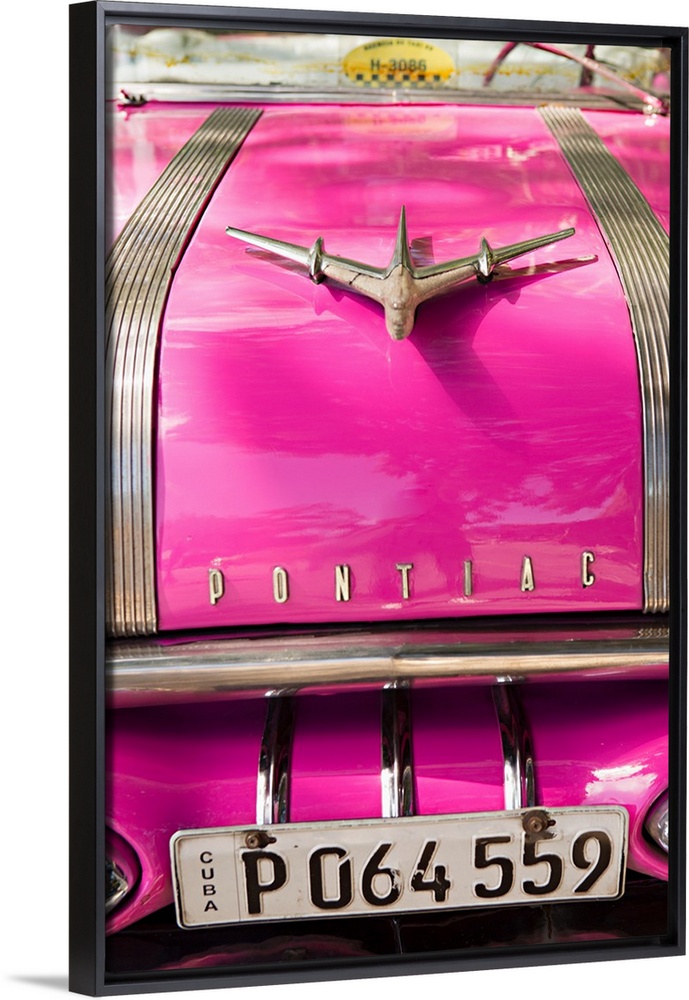 <p>Photograph of the front of a hot pink vintage Pontiac car in Cuba.</p>