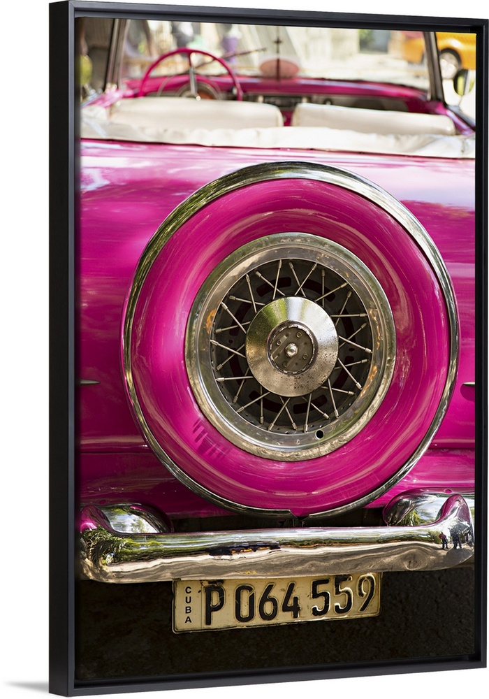 <p>Photograph of the spare tire case on the back of a vintage hot pink car in Cuba.</p>