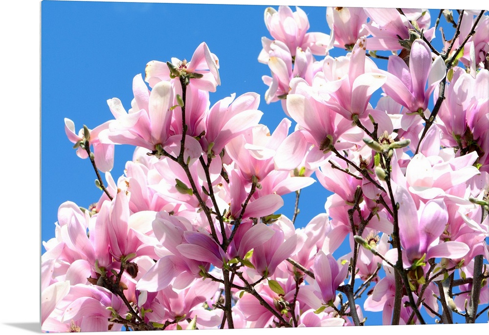 <p>Pink Chinese or saucer magnolia flowers, Magnolia x soulangeana, against a blue sky.</p>
