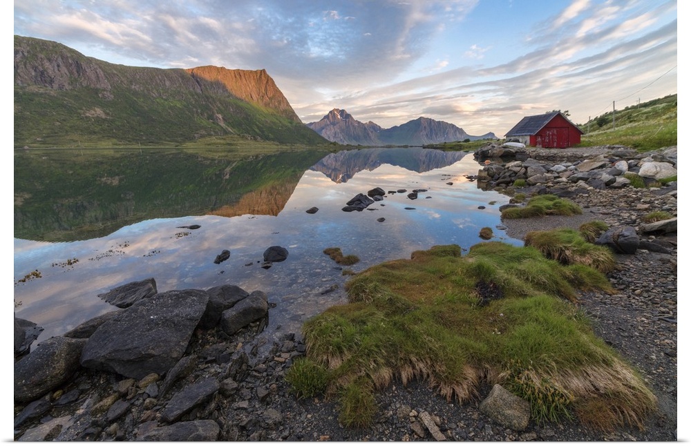 <p>Pink clouds and peaks are reflected in the clear sea at night time, Vengeren, Vagspollen, Lofoten Islands, Norway, Scandinavia, Europe</p>