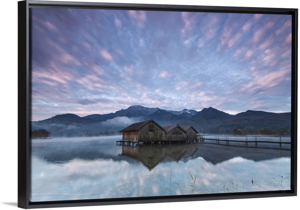 <p>Pink clouds at sunset and wooden huts are reflected in the clear water of Kochelsee, Schlehdorf, Bavaria, Germany</p>