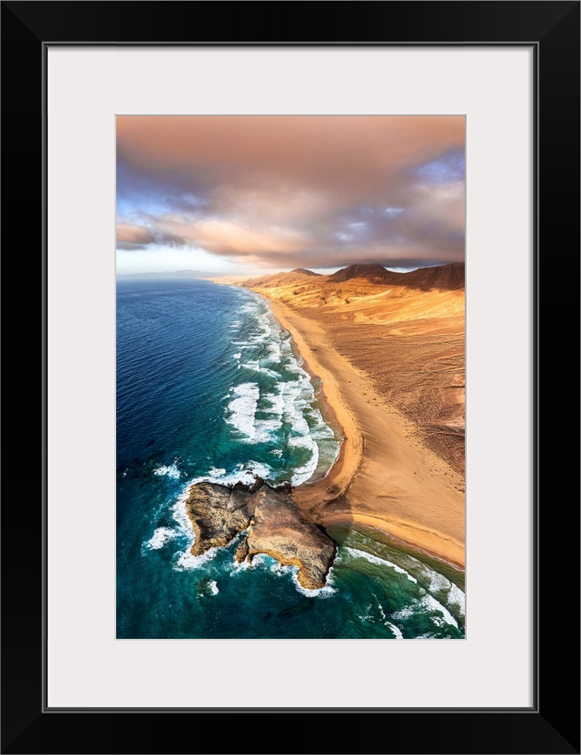 <p>Pink clouds at sunset over the golden sand of Cofete beach and headland, Jandia Nature Park, Fuerteventura, Canary Islands.</p>