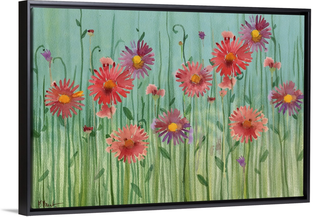 <p>Painting of gerbera daisies of varying tones on a simple background.</p>