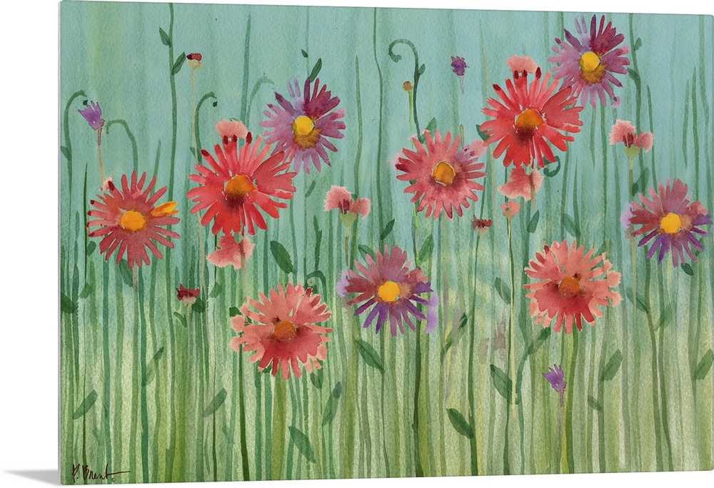 <p>Painting of gerbera daisies of varying tones on a simple background.</p>