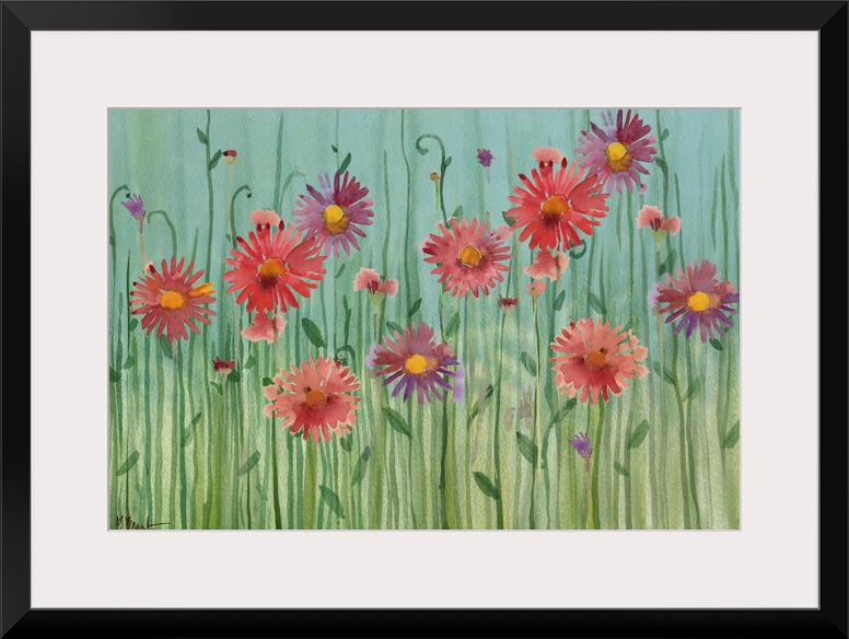 <p>Painting of gerbera daisies of varying tones on a simple background.</p>