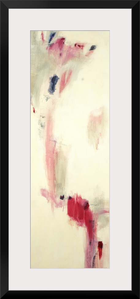 <p>Contemporary abstract painting using splashes of pink against a beige background.</p>