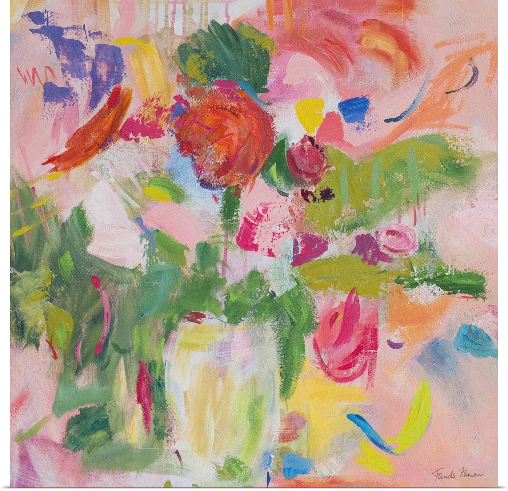 <p>A square modern painting of bright colorful flowers in shades of pink, in a vase.</p>