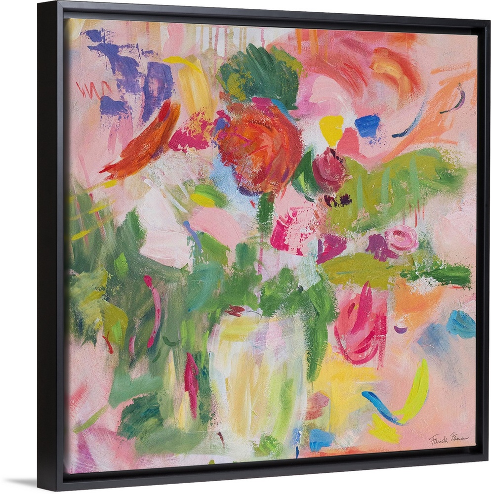 <p>A square modern painting of bright colorful flowers in shades of pink, in a vase.</p>