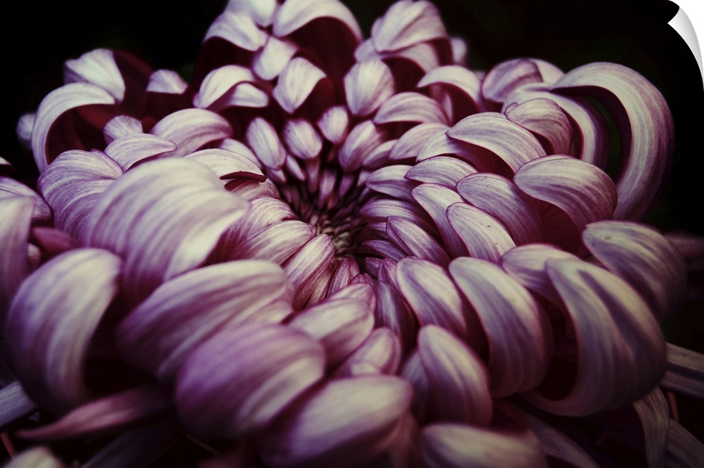 <p>Close up of a pink Chrysanthemum against a black background.</p>