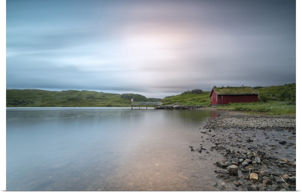 <p>Pink lights of the midnight sun illuminate sea and the typical rorbu, Holdalsvatnet, Vestvagoy, Lofoten Islands, Norway, Scandinavia, Europe</p>