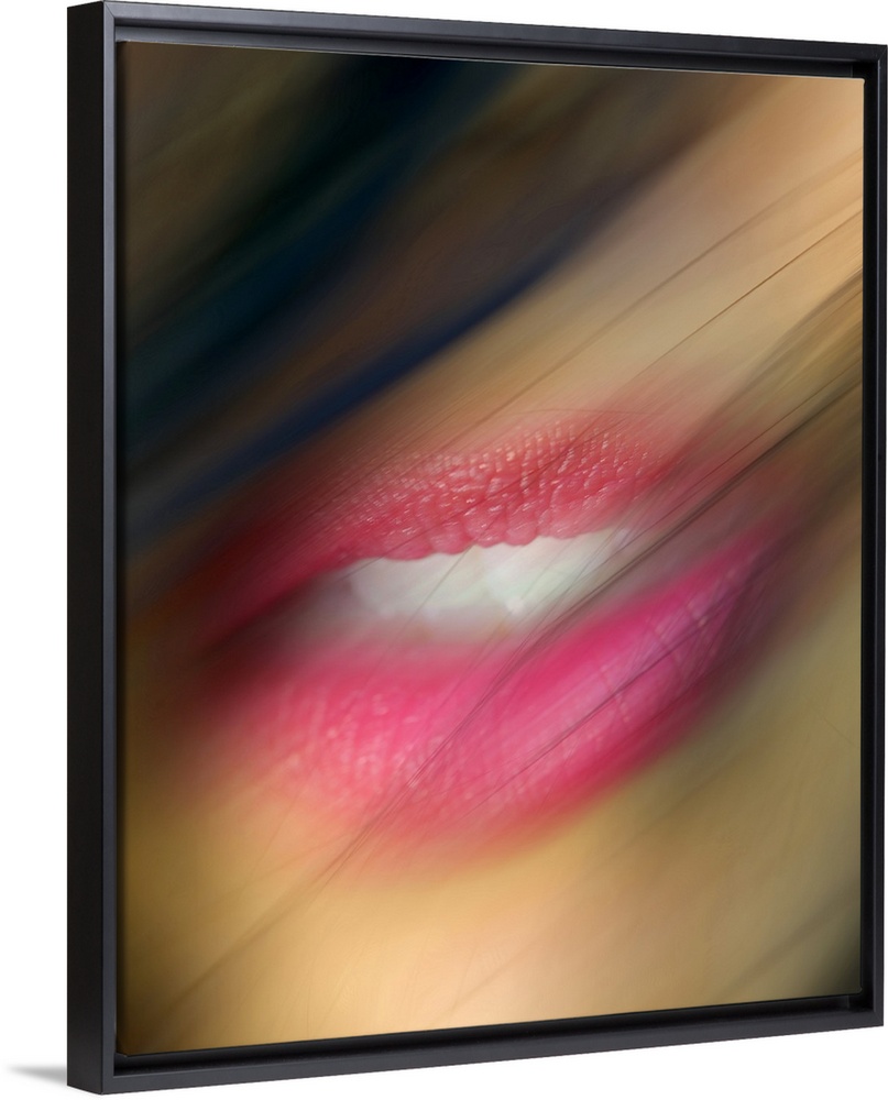 <p>Hair blows in front of a woman's lips that are photographed closely and appear slight blurry.</p>