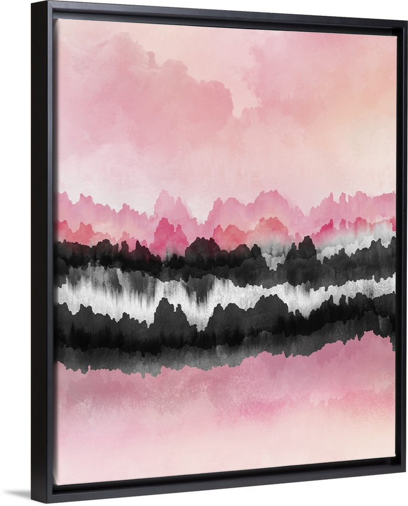 <p>Contemporary, vertical abstract design in shades of pink, blush, ivory and dark grey, with bands of color appearing to merge horizontally across the picture.</p>
