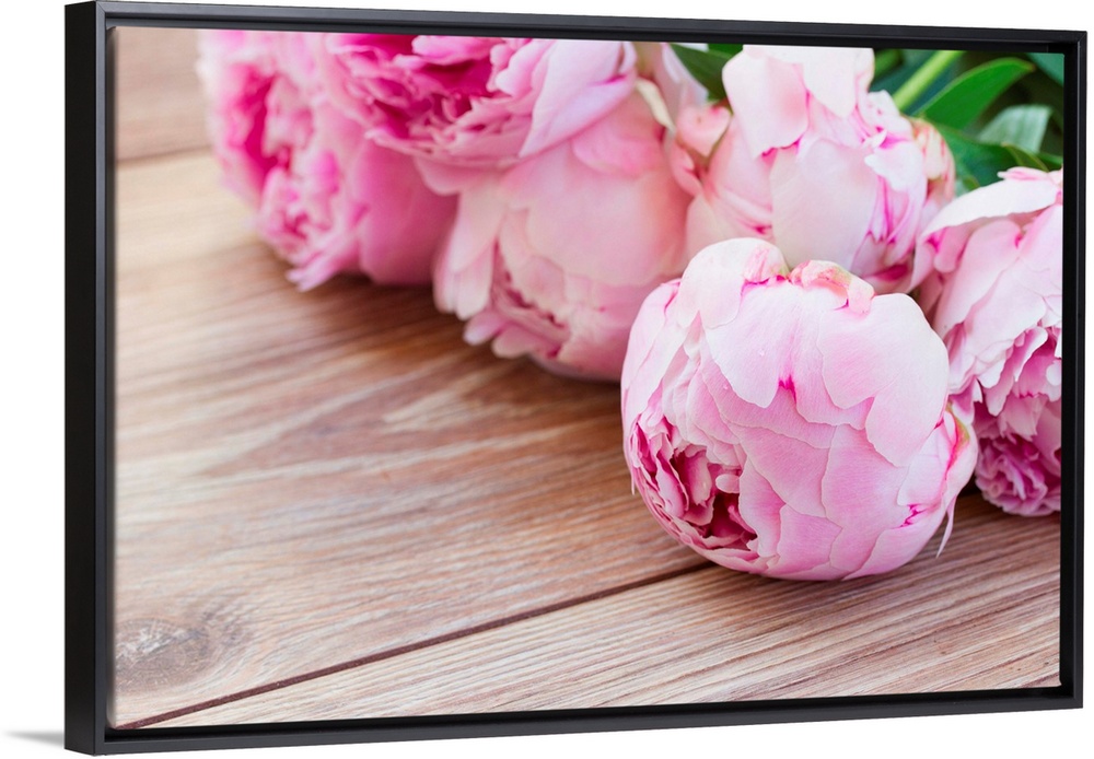 <p>Bouquet of pink peonies laying on wooden table.</p>
