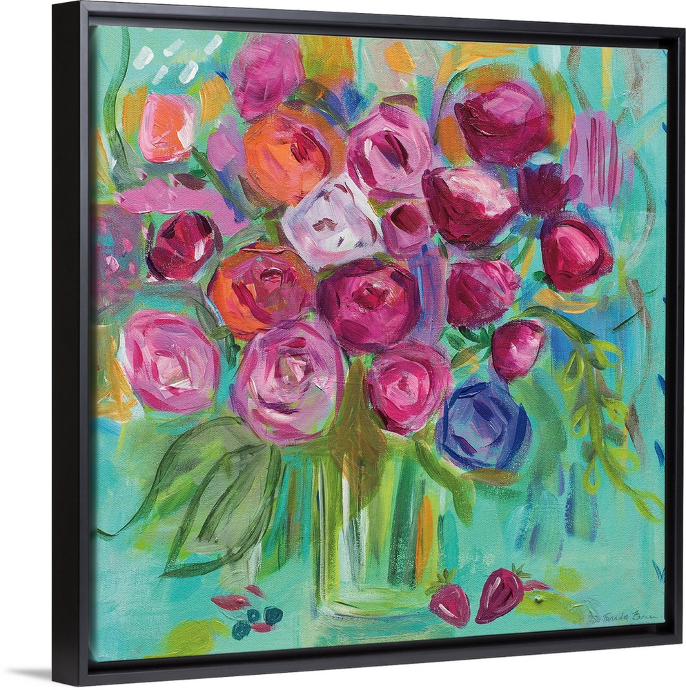 <p>Square painting of a bouquet of abstract flowers in a vase on a teal background.</p>