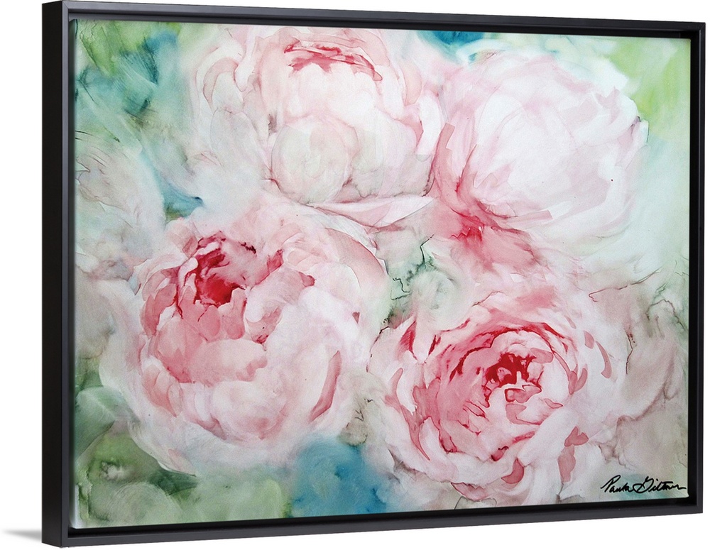 <p>Contemporary painting of pink peonies on a green and blue background.</p>