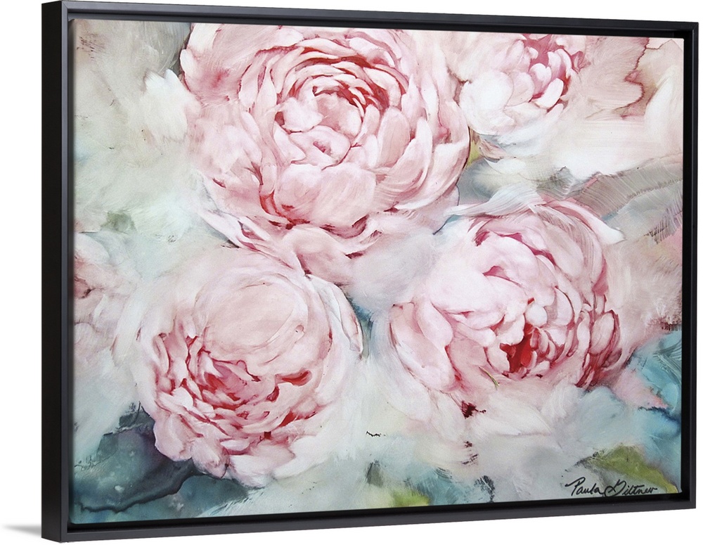 <p>Contemporary painting of pink peonies with a green and blue background.</p>