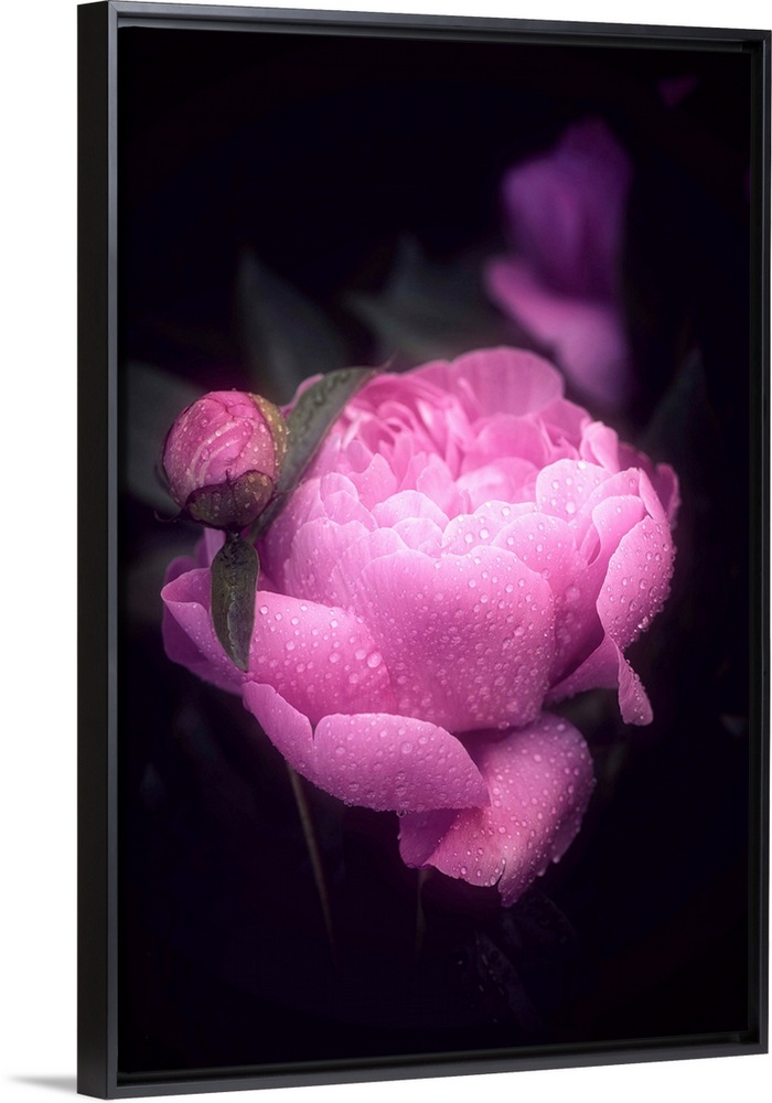 <p>Dreamlike photograph of a bright pink peony covered in water droplets with a dark background.</p>