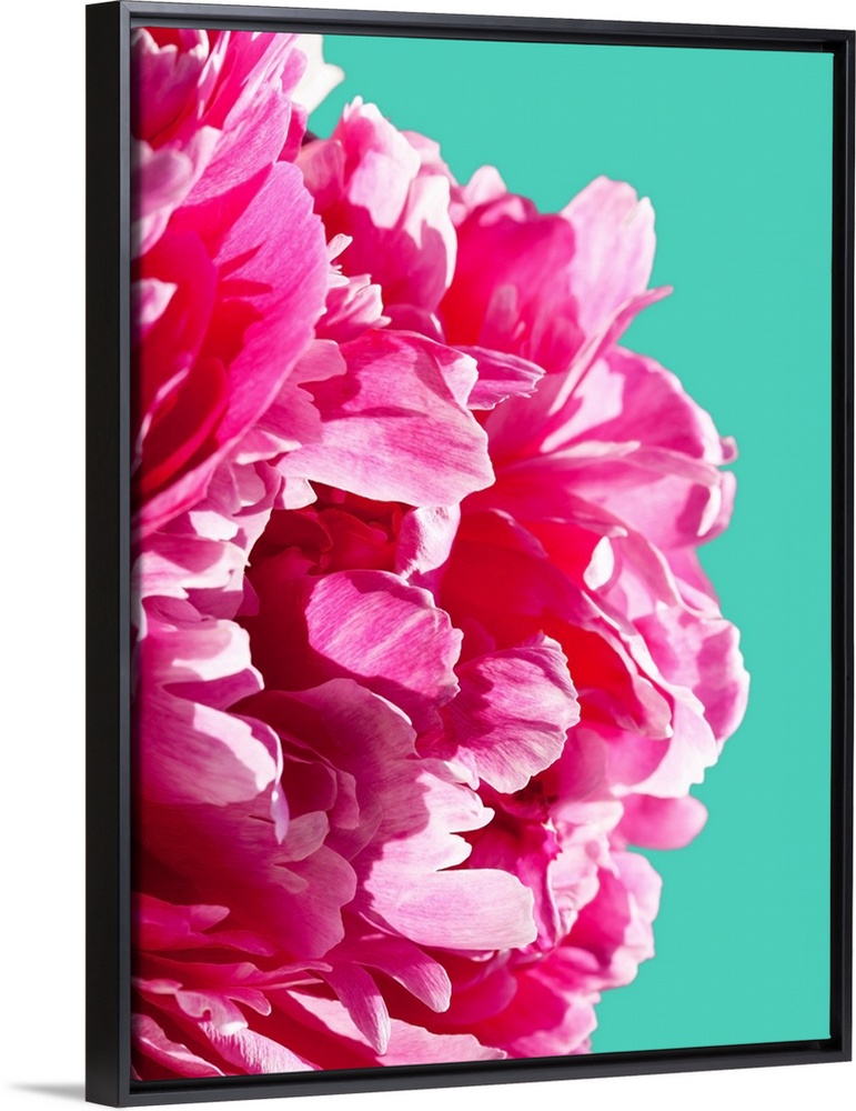 <p>A close up photograph of a bright pink peony against a blue background.</p>