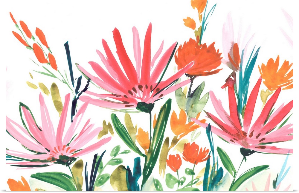 <p>A contemporary painting of bright flower blooms on leaf covered stems against a white backdrop.</p>