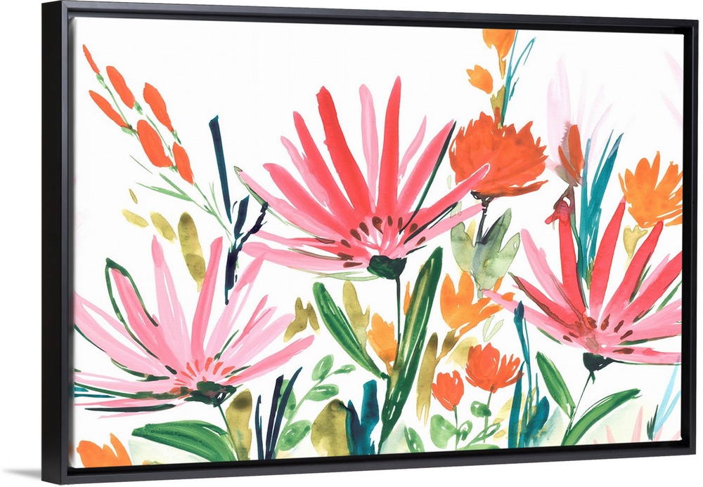 <p>A contemporary painting of bright flower blooms on leaf covered stems against a white backdrop.</p>