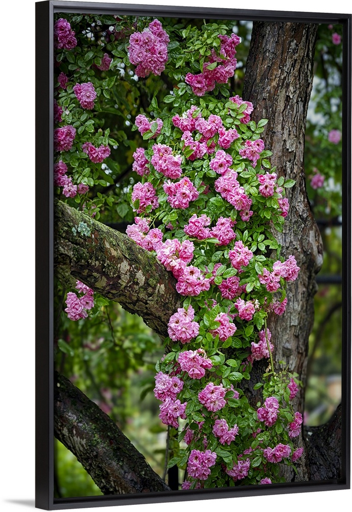 <p>Close up view of Pink Dawson Roses Climbed on a Tree in a Garden, Somerset County, New Jersey, USA</p>