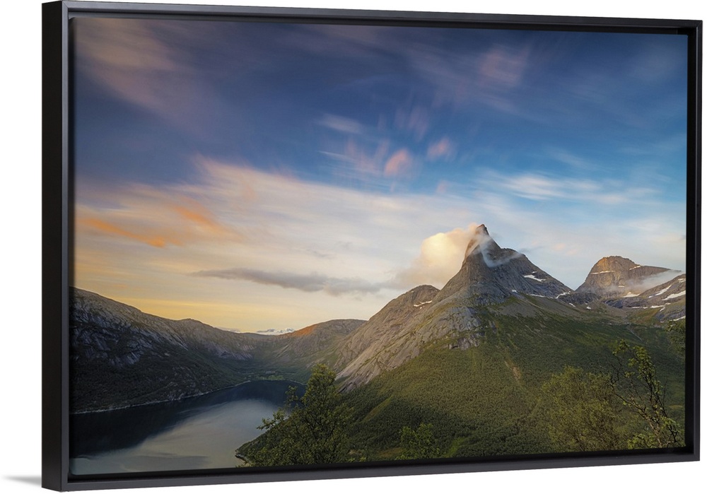 <p>Pink sky and midnight sun light up the rocky peak of the Stetinden mountain surrounded by sea, Tysfjord, Nordland, Norway, Scandinavia</p>