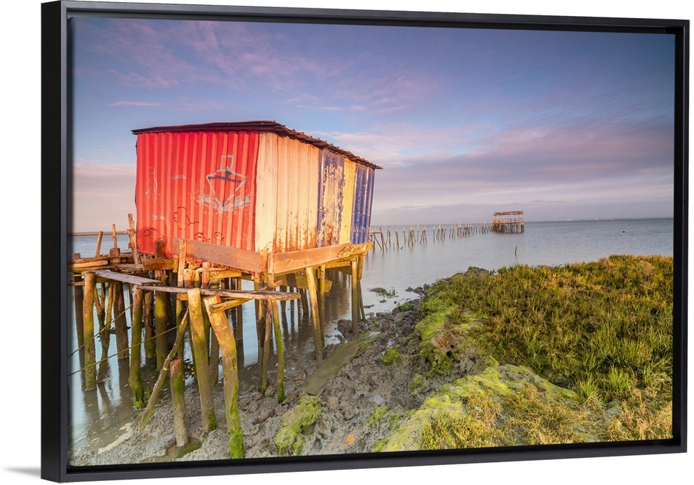 <p>Pink sky at dawn on the Palafito Pier in the Carrasqueira Natural Reserve of Sado River, Alcacer do Sal, Setubal, Portugal</p>
