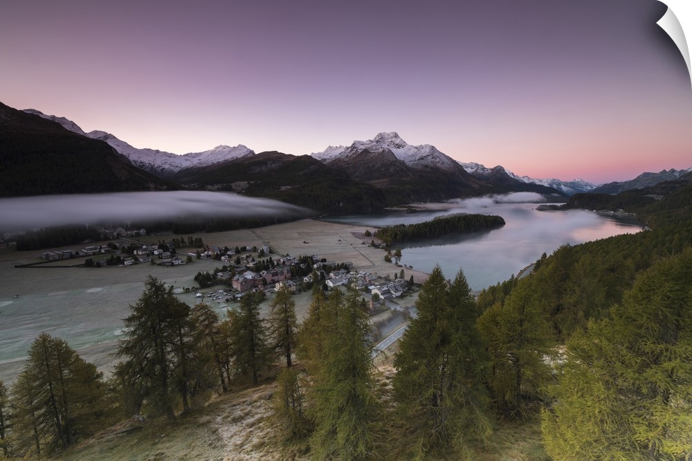 <p>Pink sky at sunrise and mist on the lake and alpine village of Sils, Canton of Graubunden, Engadine, Switzerland, Europe</p>