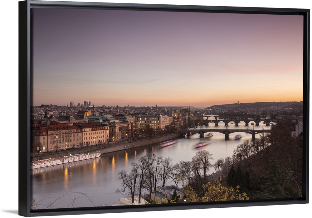 <p>Pink sky on historical bridges and buildings reflected on Vltava River at sunset, Prague, Czech Republic</p>