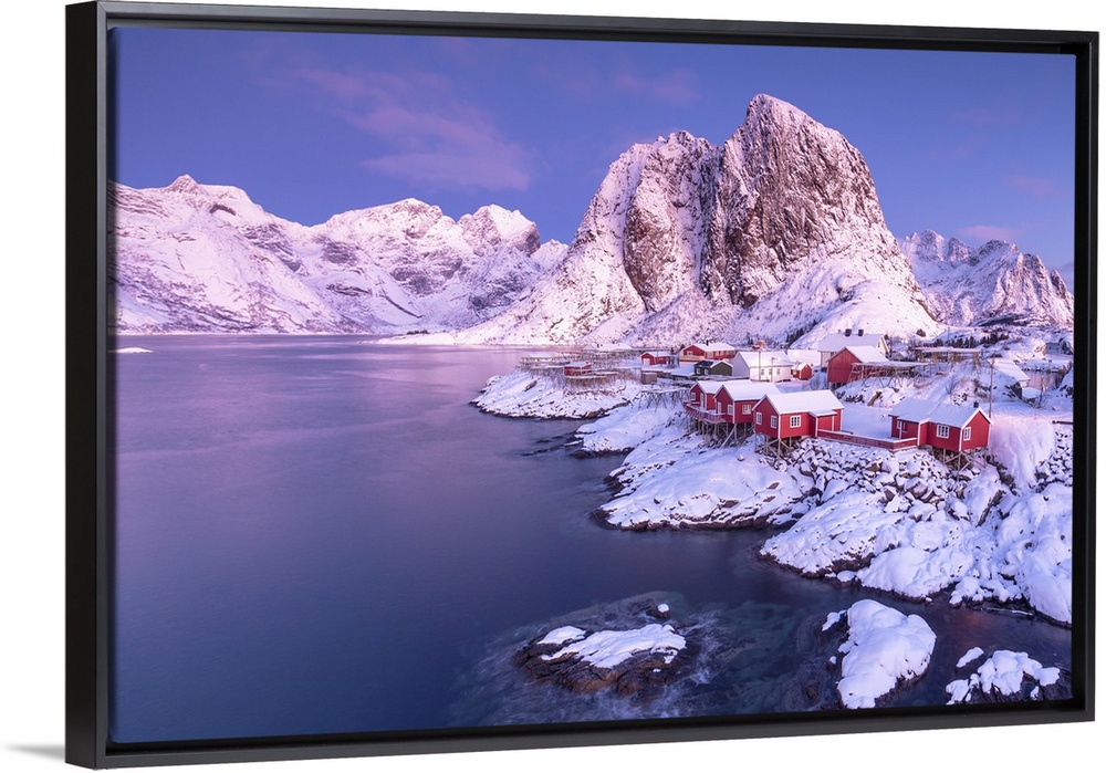<p>Pink sunrise on snowy peaks surrounded by the frozen sea around the village of Hamnoy, Nordland, Lofoten Islands, Arctic, Norway, Scandinavia, Europe</p>