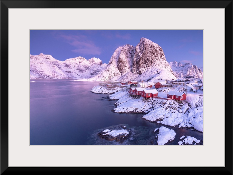 <p>Pink sunrise on snowy peaks surrounded by the frozen sea around the village of Hamnoy, Nordland, Lofoten Islands, Arctic, Norway, Scandinavia, Europe</p>