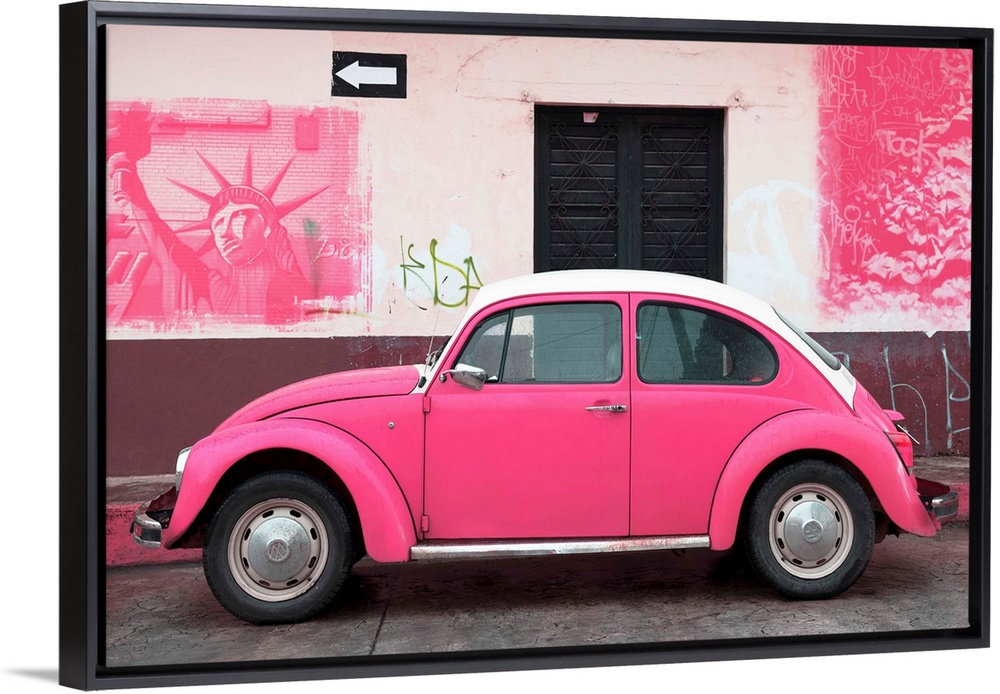 <p>Photograph of a pink Volkswagen Beetle parked in front of a wall covered in pink American graffiti, Mexico. From the Viva Mexico Collection.</p>