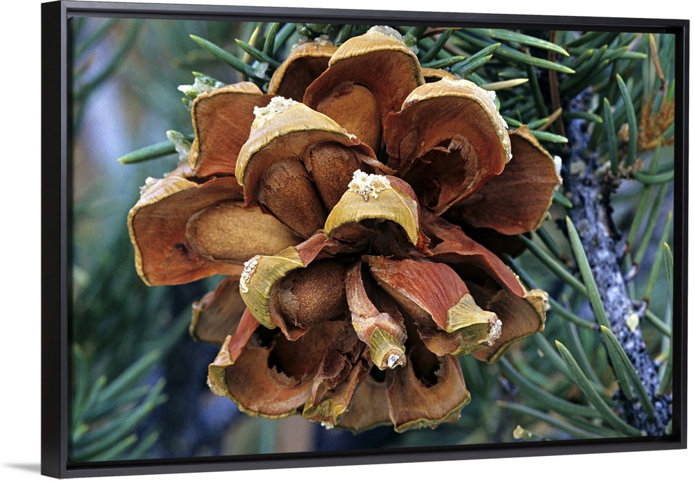 <p>Pinyon Pine cone with large, edible seeds. Pinus edulis. Small tree, semi-arid regions of the West, needles in 2s. Zion National Park, Utah. USA</p>