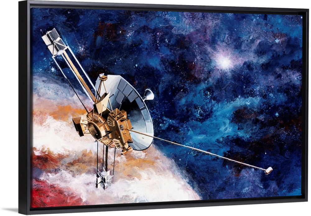 <p>Mountain View, Ca.: Artist rendering of Pioneer 10, an American Spaceprobe launched 10 years ago, will pass Pluto hurling at 30,000 MPH. Should it reach another galaxy and be found by other intelligent beings, it carries a plaque designed by Carl Sagan to identify us humans on earth as its source. Pioneer will pass Neptune on June 13 and then leave the solar system into unknown regions of the universe.</p>