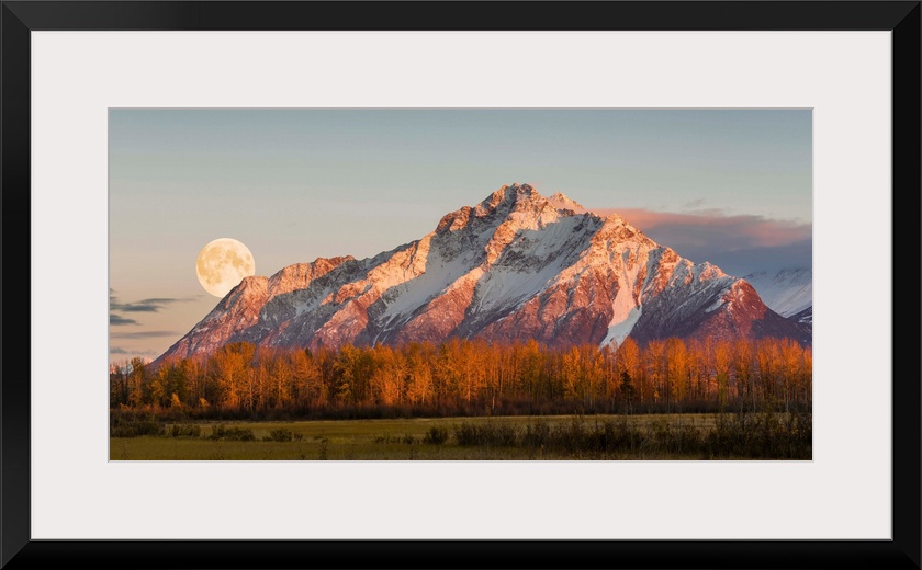 <p>Scenic sunset view of Pioneer Peak with the full moon rising over the Palmer Hay Flats, Alaska, Autumn.</p>