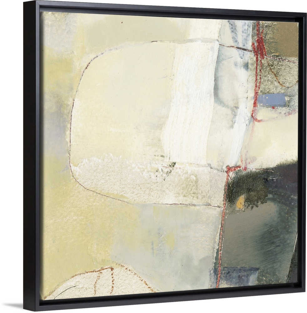 <p>Square abstract painting in neutral tones with curved lines and red accents.</p>